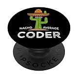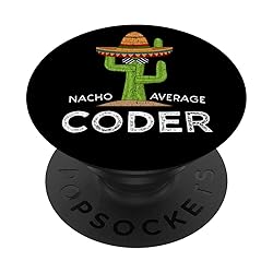 This eye-catching distressed style coding joke design features a hilarious cactus wearing a sombrero and sunglasses with the funny saying of Nacho Average Coder. Unique and fun programmer software developer coding humor themed ideas stylish for men, women, and kids alike. PopGrip with swappable top; switch out your PopTop for another design or remove it completely for wireless charging capabilities. (Not compatible with Apple MagSafe wireless charger or MagSafe wallet.) Expandable stand to watch videos, take group photos, FaceTime, and Skype handsfree. Advanced adhesive allows you to remove and reposition on most devices and cases. Note: Will not stick to some silicone, waterproof, or highly textured cases. Works best with smooth, hard plastic cases. Will adhere to iPhone 11, but not to the iPhone 11 Pro nor the iPhone 11 ProMax without a suitable case.