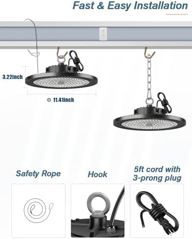 - Easy to Install- The high bay lights can be easily installed onto the ceiling using the built-in hook and safety rope. It also comes with a 5-foot extension cord with a plug, saving you time and energy to work on other projects! The suggested installation height is between 8 to 13 feet.