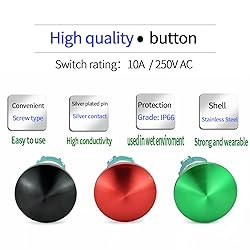 High Current: 10Amp 250V,Operating Voltage:5V/12V/24V/24V/110V/120V/250V DC/AC,Contact: 2 Normally Open, DPST.Shell material: stainless steel 304, head material: aluminum oxide red. Brand all new design 10A stainless steel push button switch,Oversized head size for easy pressing:1.34 inch /34mm. Hole size required: 7/8''(22mm),Depth behind panel: 1.12" (28.5mm),Total length: 1.57"( 40mm).Thread length: 0.39"(10mm). Longer work life: Mechanical Life: 1,000,000 cycles.Easy to install, screw teminal eliminates welding troubles, you can easily connect the switch to your circuit. 22mm 7/8in Momentary metal button switch:Self resetting ,Push & Hold, ON; Release, OFF,Can't be locked to hold.IP66 IK10 waterproof protection can be used in wet or dusty enviroment. Package Content:1 * 10A Push Button Switch. GET NEW ONE IF NOT MAN MADE BROKEN IN 3 YEARS SINCE YOU PURCHASE THE SWITCH.
