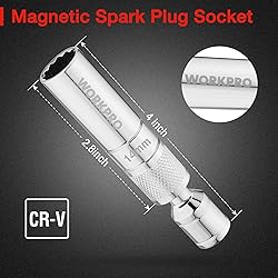 SPECIFICATIONS: WORKPRO 14 mm Magnetic Swivel Spark Plug Socket is 3/8-inch drive and 4 inches long. The inner diameter is 10.5 mm (0.41 inches), making it convenient for you to purchase and use it according to the size and thickness of the spark plug. It features a 12-point design that can grip the flat sides of the fastener head, not corners, to prevent round-off QUALITY GUARANTEE: This thin wall spark plug socket is made of heat-treated Chrome Alloy, has high hardness, and is not easy to damage when rotating. Chrome-plated mirror finish maximizes the longevity of abrasion and resists rust and corrosion. (Attention: If you are not sure of your spark plug size and don't know how to buy the corresponding size of spark plug socket, you can refer to the inner and outer diameter of the socket) 360° SWIVEL DESIGN: This spark plug has 360-degree swivel action for maximum flexibility, making tight spaces easily accessible. Flexible angle, able to deal with various situations, saving effort and convenience MAGNETIC CORE DESIGN: Our magnetic swivel socket set is equipped with magnetic core, the magnet retains and protects the spark plug for easier installation, ensures not easy to lose the plug over time, and minimizes damage EASY TO USE: The Swivel thin wall socket has an integrated design and is used for spark plug removal and installation. It doesn’t include any accessories. It features a 12-point design for enhanced gripping power, knurled grip can help you keep a tight grip to minimize the possibility of slipping in the middle of a job and reduce the chance of hand fatigue