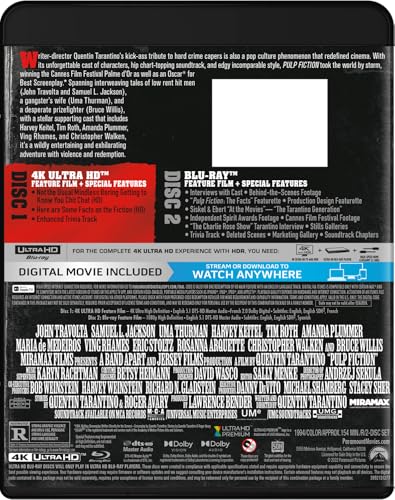 Critics and audiences worldwide hailed PULP FICTION as the star-studded movie that redefined cinema in the 20th Century. Writer-director Quentin Tarantino (Oscar® -winner - Best Original Screenplay, 1994) delivers an unforgettable cast of characters - including a pair of low-rent hit men (John Travolta and Samuel L. Jackson), a gangster's wife (Uma Thurman), and a desperate prizefighter (Bruce Willis) - in a wildly entertaining and exhilarating adventure of violence and redemption!