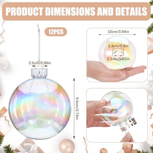 - Sufficient Quantity and Right Size: you will receive 12 pieces of Iridescent Plastic Ball and comes with a detachable silver lid and a silver string.,enough quantity to meet your usage and replacement needs; Diameter 4 inches/ 10.16 cm, plastic clear ornament balls are Clear to meet your daily home,Hallwoween,Christmas decoration needs