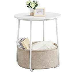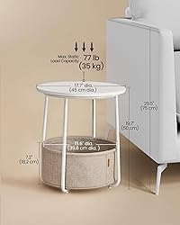 - Specifications:- Colour: Classic White, Sand Beige - Material: Particleboard, Steel, Polyester Fabric- Product Size: 45 x 50 cm (Dia. x H)- Basket Size: 39.6 x 18.2 cm (Dia. x H)- Product Weight: 4.1 kg- Max. Static Load Capacity of Tabletop: 35 kgPackage Contents:- 1 x Round Side Table- 1 x Fabric Basket- 1 x Assembly Kit- 1 x InstructionsVASAGLE Notes:- Children should not climb on or play with the side table for safety reasons.