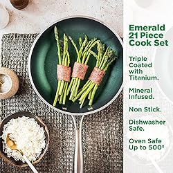 COMPLETE KITCHEN IN A BOX: This Pots and Pans Set contains everything you need to start cooking like a pro. This set includes an 8” frying pan, 10.25” frying pan with glass lid, 1.5 Qt sauce pan, a 2.5qt saucepan with lid, 5 qt stockpot with lid and complete 5 pc bakeware set and a 6-piece Nutriblade knife set. Each Piece of cookware has stay cool handles & a 10-year limited guarantee ensuring you have quality cookware for years. LONG LASTING NONSTICK: Think healthier foods, easy food release, and an effortless cleanup for years to come with Granitestone- Each piece of cookware is generously coated 3x with nonstick coating and reinforced with diamonds to deliver the ultimate food release. No oil or butter needed, makes for healthier eating, and provides for hassle free, 1-2-3 cleanup. EASY TO CLEAN: Granitestone cookware is designed for an effortless wipe down after using and is completely dishwasher safe allowing you to simply throw your cookware and bakeware in the dishwasher after using for a quick and easy cleanup experience. DURABLE AND LASTING: With customers in mind, Granitestone cookware is constructed to last years on end without any wear and tear. Each piece of cookware is durable enough to withstand any metal utensils, spatulas, spoons, whisks and even electric beaters. QUICK AND EVEN HEATING: Each piece of cookware features a solid aluminum composition and a spiralized base, quickly, and evenly conducting heat throughout the cookware from end to end, ensuring there are no dead zones or hot spots, providing deliciously and perfectly cooked foods day in and day out. HEALTHY AND NON TOXIC: Each Piece of cookware is free of PFOA, PFOS & other harmful chemicals including lead & cadmium, allowing you to Keep a healthy, toxin free, and ecofriendly cooking environment. STOVETOP AND OVEN SAFE: Each piece of cookware is compatible with all types of stovetops- Gas, electric, halogen, and ceramic – besides induction, allowing you to cook virtually anywhere you’d like. 10 YEAR GUARANTEE: With Customers in mind, Granitestone Pro Premier is constructed to provide years of outstanding usage and is backed by a 10-year limited guarantee.
