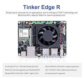 [High performance] Quad-core ARM SoC up to 1. 8GHz with 3GB RAM- The Tinker Edge R features the Rockchip RK3399Pro SoC and Mali - T764 GPU along with 2GB of Dual Channel LPDDR4 memory for system, 1 GB LPDDR3 memory for NPU and 16GB eMMC flash [Gigabit Class networking]Tinker Edge R features a high speed GB LAN port for true Gigabit Class networking throughput along with 3x USB3.2 Gen1 Type-A. It also features onboard Wi-Fi & Bluetooth for robust IoT & Network connectivity [Open-source]The board will come with fully open-source kernel and support for multiple APIs, including OpenGL, Vulkan, OpenCL, OpenVX, TensorFlow Lite, Android NN, and Caffe [HD Audio & UHD video support] It supports 192/24bit HD Audio playback with automatic Audio jack detection as well as accelerated HD & UHD ( 4K ) video playback and supports HDMI CEC for seamless power on & off configurations [WiKi]For more information please refer to the product description, any technical issues after purchase please contact with our tech-support team: click "WayPonDEV" and ask a question. Package Content: 1x Tinker Edge R (3GB+16G eMMC); 2x Wi-FiVBT antenna cable; 1x Stand offset(4xScrew+4xHex); 2x Camera MIPI Convert cable (22P to 15P); 1 x Shielding bag; 1 x Quick start guide