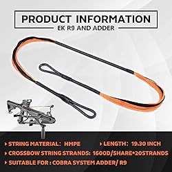 Replacement string for EK Adder Cobra System and R9 crossbow Crossbow string stand: 1600D/Share*20 stand Length: 19.3"/49cm Carefully crafted center winding in black (0.025") Material: HMPE sturdy and can be used for a long time
