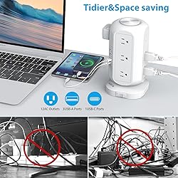 16 IN 1 Power Strip with USB: This flat extension cord surge protector with 12AC widely outlets and 4 USB charging ports (1 USB-C Port) can charge 16 devices simultaneously without blocking, keep your desktop organized; You can use it in any indoor place such as home, office and dorm room Power Strip With USB C Ports: The surge protector power strip tower has 12 widely spaced AC outlets and 4 USB (1 USB C)ports, the multi-outlet plug tower supports a wide voltage of 100V-250V, with 10A heavy duty 10 Feet extension cord is rated at 1250W ~ 125V , The total of 4 USB ports is 5V/3.4A (USB A ports features 2.4A, the USB C port features 3A) fast charge your electronic devices Flat Plug Extension Cord: With only 0.35 inch ultra slim design, this surge protector power strip has a flat plug in real sense,so that it could be easily hide in the back the furniture, beds or refrigerators;45° right angle design create an extra space for other plug below without blocking Space-saving unique tower design: AOFO charging station adopts a unique vertical design, and the top adopts a delicate CD pattern design, so that your power strip are not monotonous, and you do not need to worry about the large plugs blocking each other, which helps you save space and is beautiful ;Choose this office supply to keep your desktop clean and beautiful Multiple Safety Protection: The main body uses PC resin material with the highest flame resistance and high quality copper conductor,and has sufficient insulation resistance and durability,A breaker reset button is provided for safety of electricity use. Protects your power strips and devices in use by automatically powering them off with a temporary output overage, You can use it with confidence