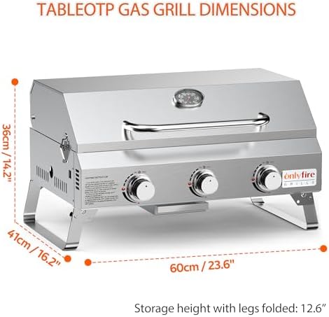 - PORTABLE WITH FOLDABLE LEGS: The heavy duty portable propane grill measures 16.2"D x 23.6"W x 14.2"H, and folded height 12" while legs are folded. This grill is designed with foldable legs which allow you to transport and store easily. The locking cover, folding legs, and carrying handle make it secured and safe for on-the-go grilling.