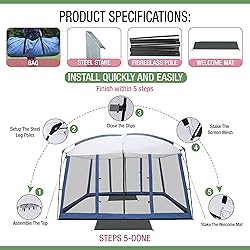 GREAT FOR CAMPING - The Backyard Expressions screen tent is a must have for camping or any outdoor gathering. It will keep the bugs at bay and provide much needed shade on a hot summer's day. Easily fits seating inside and can be perfect for protecting your outdoor dinner setting. EASY ASSEMBLY - Goes together effortlessly and in no time at all. Once it's setup you will have a great spot to relax in the cool shade all day! SPACIOUS COVERAGE AREA - The 11' x 9' coverage area is plenty of room to enjoy a nice dining or seating area. A 7.5' tall ceiling provides plenty of clearance for even your tallest friends or family members. AVAILABLE IN A VARIETY OF COLORS - The Backyard Expressions Screen Tent comes in 4 different color designs to ensure you are happy with the way it will look in your yard or campsite.