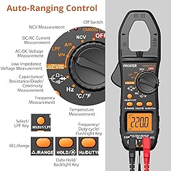 MULTI-PURPOSE CLAMP METER: AC/DC Current, Accurate AC/DC Voltage , Frequency, Duty Cycle, Diode, Capacitance and Resistance Measurement. Unique DC current measurement CLAMP JAW measures AC current up to 28mm without interrupting the circuit, which makes it much safer to use on mains cables and high current loads in vehicles AUTO-RANGING WITH NCV: The 6000 Counts meter will automatically select the appropriate decimal point place due to auto range; NCV detects the existence of AC voltage on conductors and cables in-wall, troubleshooting electrical problems in a safe way ADD LOWZ & LPF: Low impedance (LoZ) mode for identifying and eliminating ghosting or stray voltages. Low Pass Filter (LPF) for accurate measurement of variable frequency drive signals when measuring motors and transformer. Only one wires can be measured at a time. if two or more wires are measured at the same time, the measurement reading will be incorrect EASY TO USE & READ: Small and Portable to Carry and Use. High Resolution, Large Backlit LCD Screen Improves Visibility. The flashlight can Access Measurement in a Dark Place. Low Battery Display.Widely used in your life. A soft zippered pouch included keeps everything neatly together and organized