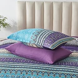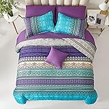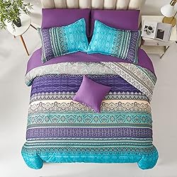 【Set Included】- 1 comforter(90"x90"), 1 Flat Sheet(90"x102"), 1 Fitted Sheet(60"x80"+12"), 2 Standard Pillowshams(20"x26"), 2 Standard Pillowcases(20"x30"), 1 Decorative Pillowcase(Only the pillowcase, not the pillow)(15"x15") 【Unique Design】The boho comforter is printed with aqua and purple chic pattern,which perfectly blends bold and vibrant colors to brighten your home with a clean and fresh look.Ideal for decorating your bedroom. 【Premium Microfiber】The suit is made of high-quality microfiber fabric,polyester filling,soft,fluffy,comfortable and lightweight,allowing you to enjoy a deep sleep all night.Since the bag is vacuum sealed,you can put it in the sun after you receive it and pat it lightly to fluff it up. 【Superb Craftsmanship】The Boho Bedding Set uses a unique tight stitching process to complete the bedding combination, preventing the quilt from moving and clumping. Let you enjoy a comfortable sleep. Durable and suitable for all seasons. 【Easy Care】The 8-piece bed set is machine washable in cold water, gentle cycle,tumble dry on low temperature.Do not bleach.Colors will stay bright and vibrant after repeated washes.