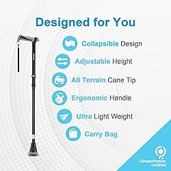 Up To 8 Adjustable Height: Rehand adjustable cane fits for people from 5'(152cm) to 6'5''(195cm). 8 adjustable height with one-inch increments makes almost all seniors, elderly and injured persons can easily adjust the cane to proper height fitting user's height. The adjusting range of walking stick itself is from 2'7'' (78cm) to 3'2'' (96cm). Relieve Palm Pressure: Compared with traditional T grip devices, rehand innovative handle is longer and wider, and can offer bigger contact area with palm. Handle's hard PP material offers more supports and confidence while soft TPR material offers more comfortableness and stableness. Ergonomic hand grip can reduce palm fatigue and prevent muscle cramping dramatically. High quality nylon wrist strap allows users to feel like seamless extension of the body. All Terrain & Shock Absorbing: Cutting edge patented technology combines these 2 in 1. All terrain slip-resistant base provides superior stability and ground contact on uneven surfaces. Multilayer rubber structure absorbs shocks and dampens the impact on the joints and muscles from shocks. Entire base system maximizes the safety in daily mobility. Wrap It Up: Being constructed with durable & lightweight aluminum frame, with a collapsible design, this walking stick can be wrapped up in seconds and easily can be fitted into a briefcase, wheelchair bag, or even purse. A premium hook & loop fastener tape on the cane shaft comes as standard, which can be used to tie up the cane conveniently. All thoughtful designs make carrying and storage no headache anymore. Premium Mobility Aids Solution: Adpoted with the latest innovation, walking cane from rehand medical redefines the premium balancing mobility aid. With the cane in hands, you will see this particular cane was designed just for you and your loved ones. What you get: a folding cane, a travel bag, a friendly customer service and a brilliant using experience.
