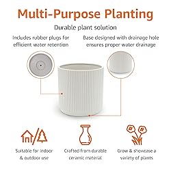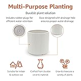 Ceramic planter with 8-inch diameter. Perfect for planting succulents, herbs, flowers, house plants, and more. Sleek and modern white fluted appearance. Ideal for both indoor or outdoor use. Includes drainage hole and rubber plugs for proper plant maintenance.