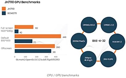 - [High Integration JH7110 64-bit SoC] StarFive JH7110 with RISC-V U74 quad-core with 2MB L2 cache and S7 monitor core, supporting RV64GC ISA, working up to 1.5 GHz.comes paired with IMG BXE-4-32 MC1 GPU,work frequency up to 600 MHz (400 MHz by default).Suport with Vision DSP, NVDLA engine, and neural network engine for AI acceleration.