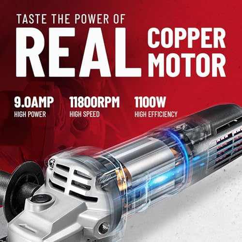 9.0 Amp Angle Grinder, 4-1/2 Inch Electric Grinder Power Tool, 11800 RPM, Auxiliary Handle and 2 Safety Guards, 6 Piece Discs, Copper Angle Grinder for Cutting, Grinding, Polishing (KSM17-115B)
