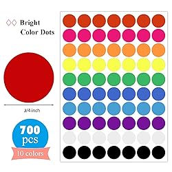 Great Value - 700PCS Color Coding Labels: Pack of 700 in total, 70 color dots per sheet, 10 sheets round stickers. Each of these colored dot stickers measure 3/4 inch in diameter. Bright Color Dots and Large Assortment of Colors: Our circle dot stickers are used as great color coding labels. Great vibrant colors for color coding, sealing products and envelopes. The color dots come with lots of color options: red dot stickers, green dot stickers, blue dot stickers, yellow dot stickers, purple dot stickers, white dot stickers and black dot sticker. Practical and Functional Color Dots: Our circle dot stickers is great for preschooler homeschool activities, and also help differentiate between papers, folders, hard discs, flash drives, office drawers, boxes, and other office supplies. Great round stickers for office work, home and school use. Easy Peel and Stick Well: Easier for small fingers to grab. The paper is high quality, they stick very well and don’t tear. Our colored dot stickers are easy to peel and use, environmental and BPA Free! You can stick them to DVDs, books, notebooks, glass jar, or any other surfaces. Circle Dot Stickers - Easy to Write: A smooth surface of colored dot stickers helps write on them with pen easily. Great for a variety of uses in filing, inventory, sales price, art, education, color coding systems, office school classroom, adults & kids crafts project.