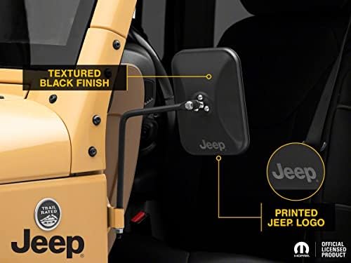 Adventurous Styling. A set of Officially Licensed Rectangular Adventure Mirrors will give your JK the rugged good looks of an adventurous off-road vehicle. These Rectangular Adventure Mirrors not only look great, but they will also improve your range of rear visibility on both the street and the trail. Finished in a textured black finish, each Mirror features the logo expertly printed in white on the back for extra visual appeal and a distinctively bolder look.Stay Street Legal. If you're like most enthusiasts, you love taking the doors off your Wrangler in warm weather, but in doing so you lose your factory mirrors. Installing a pair of Officially Licensed Rectangular Adventure Mirrors will keep you street legal as these mirrors can be installed with your doors removed.Superior Quality. These Rectangular Adventure Mirrors are manufactured with heavy-duty steel round bar and plastic housings to ensure durability and reliable performance on and off-road. The steel bars are then complete in a textured black, powder-coat finish for aggressive good looks and long-lasting corrosion resistance.Officially Licensed Product. These Adventure Mirrors feature an officially-licensed logo printed in white on the back side for impressive styling. With these Mirrors being officially licensed, you can be assured that it is only of the highest quality.Easy, Bolt-on Installation. These Rectangular Adventure Mirrors are designed to install simply in the upper door hinge of your Wrangler using just basic hand tools. There is no drilling or cutting required for a clean, straight forward installation that can be completed in about 30 minutes.Application. These Officially Licensed Rectangular Adventure Mirrors with Printed Logo; Textured Black are compatible with 1966-2018 Wrangler CJ5,