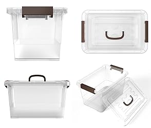 Space-Saving Capacity: External 12 x 8 x 7.2 inches / Internal 10.8 x 6.7 x 6.5 inches dimensions fit tight spaces (closets, corners). 7-quart capacity ideal for small items (ornaments, blocks, makeup) to reduce clutter. Durable Sturdy Construction: Made from high-quality sturdy plastic that withstands repeated use, ensuring long-lasting reliable organization for home or office. Minimalist Transparent Design: Clear plastic body with brown handle and latches for a clean, elegant look. Transparent material allows quick content scanning without opening—saves time searching. Secure Latches for Protection: Equipped with secure latches that keep the lid firmly in place, providing extra protection for stored items and preventing spills or dust. Versatile Multi-Scene Use: Suitable for dry goods, tools, groceries, drinks, snacks, candy, off-season clothing, costumes, shoes, and more—meets diverse storage needs.