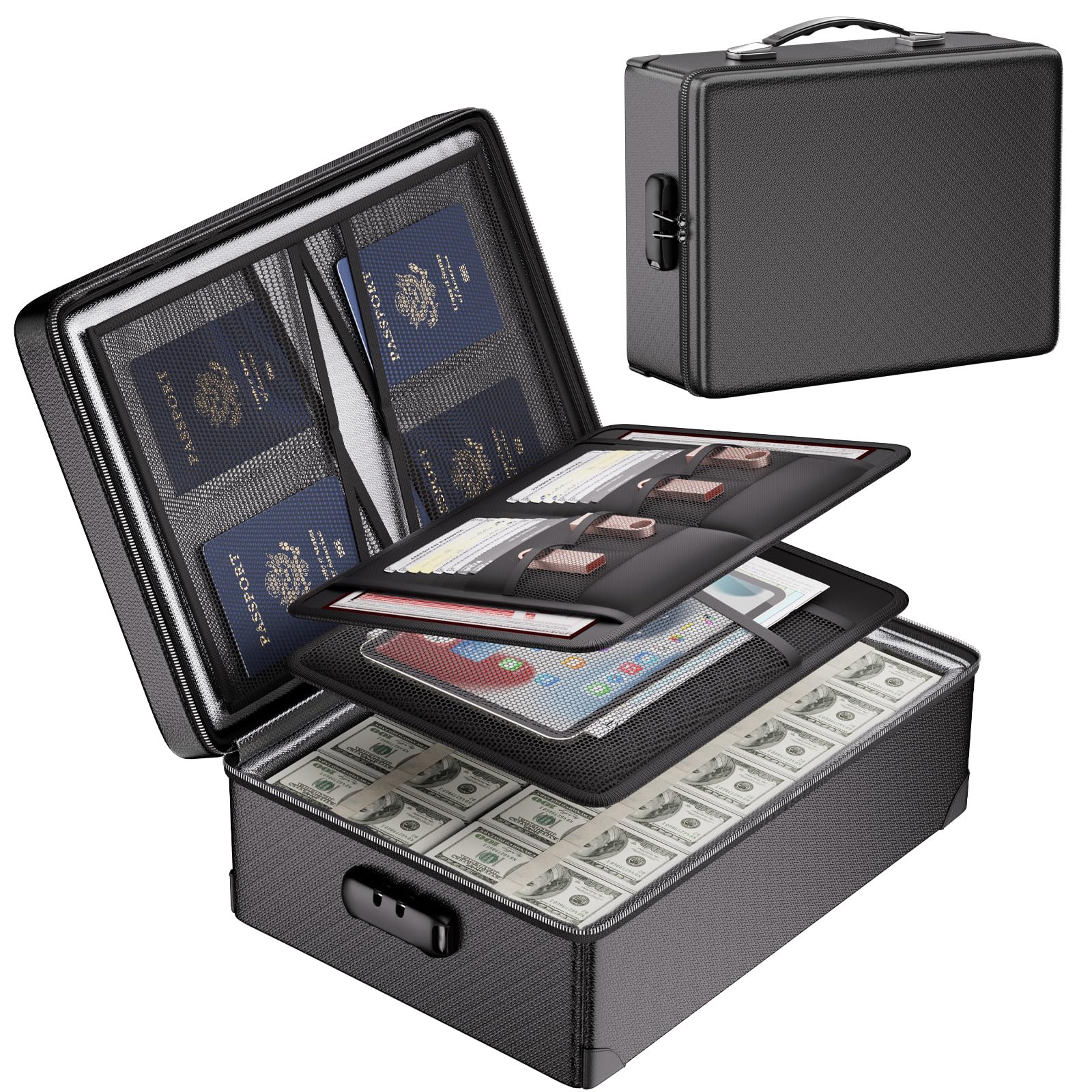 - Multi-Layer&Large-capacity(16"x13.8"x12.2"): Compared with other file boxes, our fireproof file box adopts a multi-layer design that can meet all your storage needs. These include 8 passport mesh bags, 16 card slots, 4 U disk pockets, 2 mesh bags, 4 outer pockets, 1 large pocket, and one main pocket with large space. They are ideal for storing cards, passports, CDs, USB, albums,certificates and other valuables.The main pocket can fit both letter and legal-size files or anything else you want.