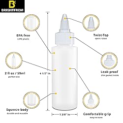 ROBUST AND USER-FRIENDLY: Made from high-density polyethylene (HDPE), these 2 oz squeeze bottles are both strong and BPA-free, ensuring they are safe for use with foods, arts, crafts, and any other liquids. The sturdy material provides durability for both professional and home environments. PRECISE AND LEAK-PROOF DISPENSING: Featuring a twist open and close top, these applicator bottles offer a reliable solution to prevent leaks and spills. The design ensures you can dispense your products with precision, whether it's for culinary arts, hair coloring, or crafts. EXTREMELY VERSATILE: These bottles are an essential tool for a wide array of applications. Perfect for storing and applying body lotions, shampoos, conditioners, tattoo inks, paints, and other similar products, they meet a variety of needs in personal care and creative projects. COMPACT AND PORTABLE: Their 2 oz size makes them ideal for small batches or for use while traveling. Easy to fill and use, these bottles can fit into any bag, making them perfect for those who need solutions on the go. REUSABLE AND ECO-FRIENDLY: Designed for repeated use, these refillable bottles are an excellent choice for those looking to reduce their environmental footprint. Simple to clean and maintain, they provide a practical way to manage liquids without constant waste.