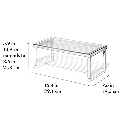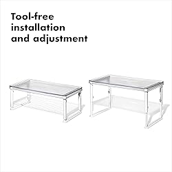 Five adjustable heights for a custom fit in your fridge Sturdy shelf keeps items visible to help prevent food waste Tapered legs leave space under shelf riser Non-slip feet stand securely on solid and wire refrigerator shelves Tool-free installation