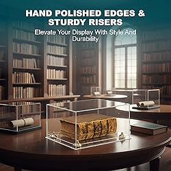 - "Protect and showcase your valuable books and collectibles with our premium display cases, designed to combine elegance with durability. This beautifully crafted acrylic book case is made from 1/8"" thick, high-clarity acrylic that provides long-lasting strength while keeping your items fully visible from every angle. The front and top are constructed from a single sheet of acrylic (plexiglass), creating a seamless rollover design with fewer joints for a sleek and professional look. Unlike standard enclosures, this book protector case keeps your collection safe from dust, fingerprints, spills, and accidental damage while maintaining a crystal-clear presentation.The case is designed to elevate your display, giving your items a professional appearance that enhances any bookshelf, office, or showroom setup. Its smooth, polished edges and flawless transparency make it a stunning centerpiece for your collection. Whether you’re displaying a rare signed edition, a family heirloom, or valuable memorabilia, this book preservation box helps protect your collection while adding a sophisticated touch to your décor.This versatile design makes it an ideal choice for both collectors and gift givers. From rare novels to historical documents, the case protects while elevating presentation, making it perfect for personal collections or professional displays. Memorabilia pictured in the display is not included, but with this case, you’ll always have the perfect solution to highlight your story in style."
