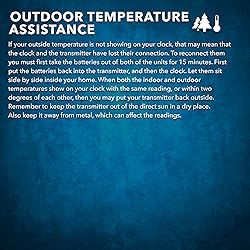 NEW & IMPROVED!!! We listened to your comments, and the clock now has ALWAYS ON BACKLIGHT WHEN PLUGGED IN and FULL COLOR SCREEN! Improved clarity and brightness – All in color! ELECTRIC POWERED with ON DEMAND BACKLIGHT BATTERY OPERATION: Plug into standard household wall outlet – The Sharp Atomic Clock with Color Display is compatible with 110V/120V power outlets - to power the clock with “always on” display. Will also work on Battery Optional Mode (Main unit 3 x AA batteries - Sensor 2 x AAA batteries (not included). While operating under battery power, use the BACKLIGHT button to illuminate the display for 5 seconds. Quick-Start Guide: Atomic Setting – After 10, minutes of the atomic clock receiving power, it will begin searching for 100 WWVB Radio (atomic) signal. The Atomic signal will begin to flash on screen, and it will search for 7 minutes. If signal is achieved, the atomic signal will stop flashing. If the clock fails to connect in first attempt, it is usually received by morning. See instruction manual in package for full details and instructions.