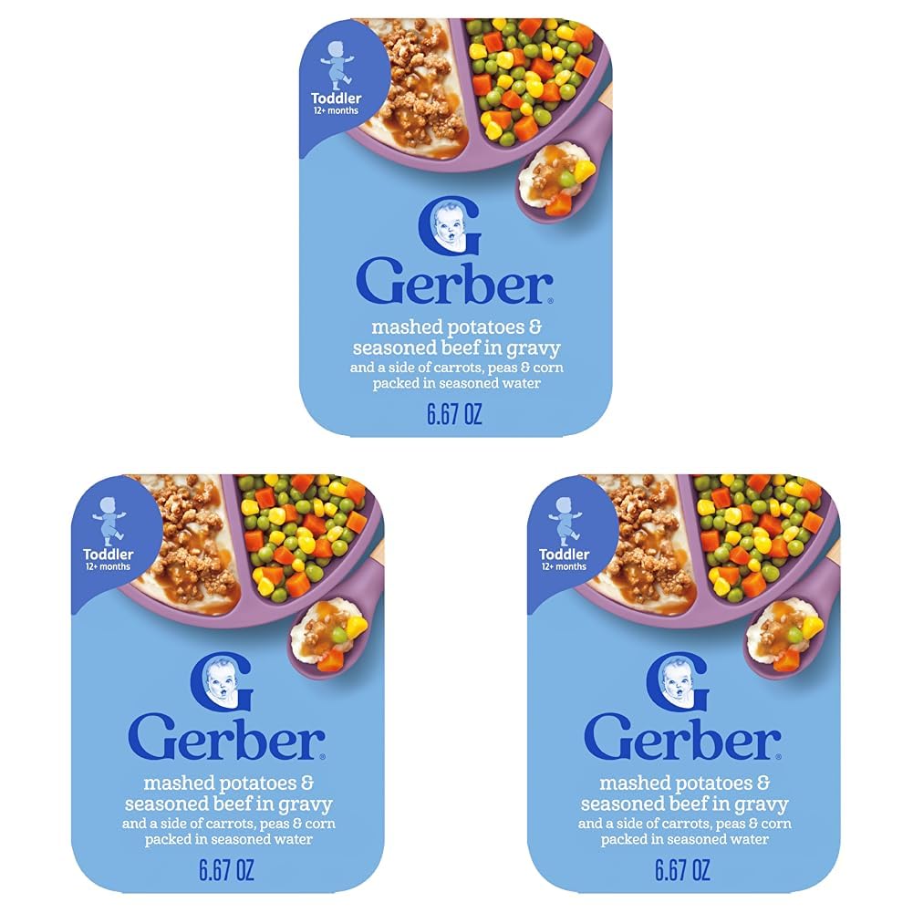 - MEALTIME FOR TODDLER: This toddler approved mealtime comes with mashed potatoes & seasoned beef in gravy with a side of carrots, peas and corn. Ready to eat in under 5 minutes, Gerber mealtime for toddlers is perfect for busy parents who need a quick and nutritious option for their little one