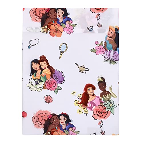 The Disney Princesses Courage & Kindness 4 Piece Toddler Bed Set includes a comforter, fitted bottom sheet, flat top sheet, and reversible pillowcase. This sweet comforter measures 42" x 57" and features Princess Rapunzel, Tiana, Moana, and Snow White. Detailed with lovely florals in shades of pink, blue, yellow, green, and orange. The fitted bottom sheet and flat top sheet are both featured in a pretty allover pattern with all the princesses who have courage and kindness, Ariel and Tiana, Mulan and Belle, Cinderella and Jasmine, Moana, and Snow White! The top sheet measures 45" x 60" and fits a standard size crib/toddler mattress. The fitted sheet measures 28" x 52" and includes full elastic edges for a safe and snug fit. The reversible pillowcase features enchanting princesses. Measures 20" x 30" and uses a standard size pillow. All made with snuggly soft fabrics! Coordinates with Disney Princesses Courage & Kindness toddler bedding and accessories!