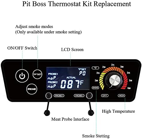 - 【Upgraded Thermostat】To prevent the ignition rod from short-circuiting and burning out the controller,our control boards have fused devices. Pit Boss temperature controller replacement is equipped with high clear LCD screen and 2pcs meat probe interfaces; PID digital program could make the cooking more stable and safe thanks to cool down cycle.