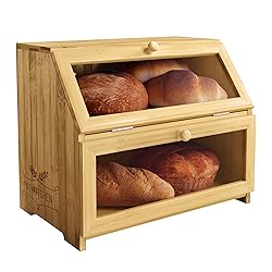KIFIKITCHEN Bamboo Bread Box Space Saving Rustic Flat-Top Bread Bin for Countertop - Store Bread Cake and Baked Goods - 15 x 9.8 inches (2 Tier box)