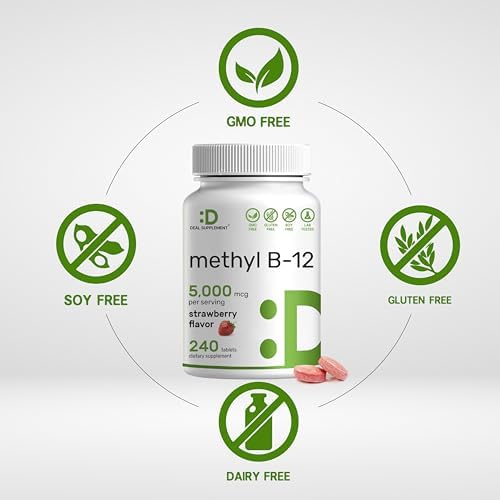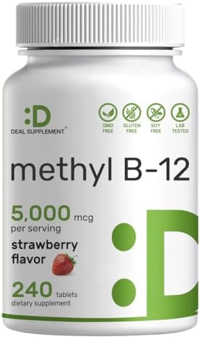 DEAL SUPPLEMENT Methyl B-12 Vitamins 5000 mcg, 240 Chewable Tablets | Active Form - Strawberry Flavored - Energy Support & Brain Health Function - Vegetarian & GMO Free