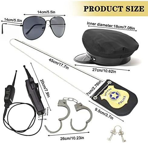 - 【Valuable Police Toys Pack】Our police cosplay props include a police hat, a police badge, a pair of toy handcuffs with keys, a pair of sunglasses and a toy walkie-talkie. The whole set of props makes your child feel more immersive when playing the police game, which may help your child to set up a dream of being a police officer from now