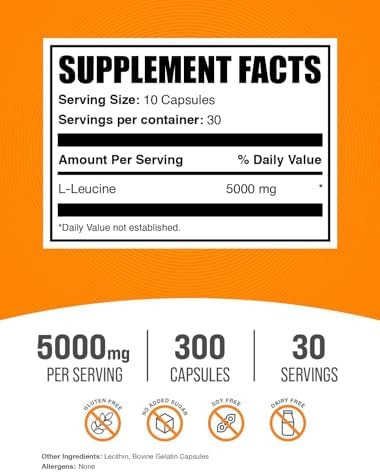 BulkSupplements.com L-Leucine Capsules - Leucine Supplements, Amino Acid Supplement - Gluten Free, 10 Capsules per Serving (5000mg), 300 Count (Pack of 1)