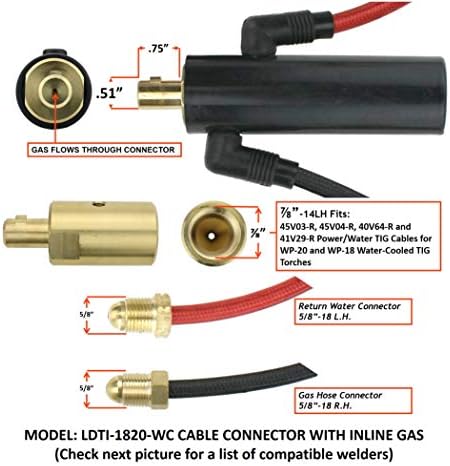 High-quality INLINE Dinse 35-70 Plug with 18" returning water hose with 5/8"-18 LH connector and 18" Argon Hose with 5/8"-18 RH connector Check the pictures with dimensions and compare them with your existing Torch Cable and Welder´s Plug Receptacle. Check the table with a list of the most common welders compatible with this type of inline connector. This Dinse connector is used ONLY on Water-Cooled TIG Torches, (Models 20 and 18). It will not fit Air-cooled torches of any kind. This Dinse connector is used ONLY with Welders with gas solenoid and Inline gas pass through the connector plug.