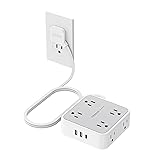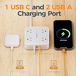 11 in 1 Power Strip: Power strip with surge protection has 8 AC outlets (1250W Max), 1 USB C (15W Max) and 2 USB A (12W Max per port), charges 11 devices simultaneously without blocking; 5 Ft flat extension cord has no messy cables on desk and keeps your desk tidy. NOTE:Make sure your devices don't exceed a power of 1250W Extension Cord Flat Wall Plug: This flat plug power strip 5 ft easily reaches distant outlets without excess length on the floor; 0.15 inch thick flat cord fits through door gaps and under carpet; 45 degree right angle design doesn't block the outlet below 1 USB C and 2 USB A Ports: The power strip with USB ports features 1 USB C (5V 3A, 15W Max), 2 USB A delivers 5V 2.4A, 12W Max per port, This plug extension outlet meets your various charging needs for phone, tablet, and other devices. Please ensure your devices’ power is within USB port's limit 900J Surge Protector Outlet: Extension cord with multiple outlets has overcurrent, overvoltage, overload, and short circuit protection offers a comprehensive safeguard for electronics; The switch shuts off automatically during overloads to protect devices Mountable Power Strip: The USB power strip has 2 mounting holes for secure installation on workbenches, walls, under counters, and more; 4 rubber feet on the bottom effectively prevent slipping and sliding; You can use it in home, office and dorm room