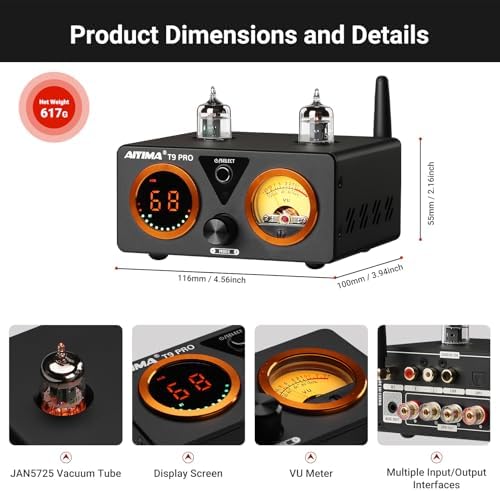 AIYIMA T9 PRO 200W Bluetooth Amplifier HiFi Digital Class D Power Amp 2.0/2.1 Channel Vacuum Tube DAC Amp with VU Meter & Bass Treble Bluetooth 5.2 Coaxial Optical PC-USB inputs