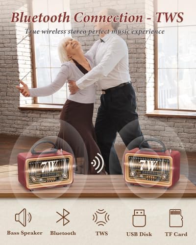 PRUNUS Retro Vintage Radio with Bluetooth Rich Bass Stereo Sound, Radios Portable AM FM, Rechargeable Speaker with TWS Pairing, Loud Volume,BT5.0, TF Card & MP3 Player for Home/Party