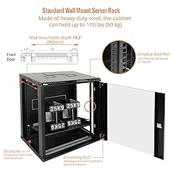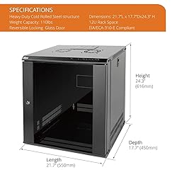 Save valuable floor space: 12U wall mount server cabinet Dimensions: 24.25" H x21.65" W x17.72" D. MAXIMUM MOUNTING DEPTH is 14.2". Keep critical network equipment secure: glass door and side panels are lockable to prevent unauthorized access; Front door can be installed on either side of the front of the cabinet to satisfy your door swing orientation preference Easy equipment configuration: Fully adjustable mounting rails and numbered U positions, with square holes for easy equipment mounting with top and bottom punchout panels for easy cable access Durability: Made of high quality cold rolled steel holds up to 110lb (50kg) (Easy Assembly Required) PCI & HIPPA and EIA/ECA-310-E compliant