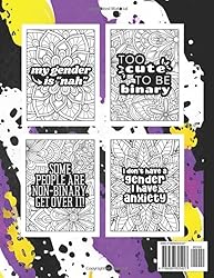 - Are you EXHAUSTED from having to explain your identity? Tired of being misgendered? I feel you! Kick back, de-stress and have a giggle with The Future Is Non Binary Coloring Book. Enjoy 30 unique coloring pages each with funny quotes and captions that only non binary people can relate to like…TOO CUTE TO BE BINARYI DON’T HAVE A GENDER, I HAVE ANXIETYMY GENDER IS “NAH”Are you an ally looking for non binary gift ideas? This coloring book is a suitable gift for a genderfluid or non binary person. It makes a sweet and unique gift for birthday, anniversary, Christmas, Valentine’s Day or International Non-binary People's Day! Fly your non binary flag and BUY NOW! Features:8.5 x 11 inches - large size30 coloring pages with blank page behind each one to prevent bleed through - safe for markersSoft matte cover