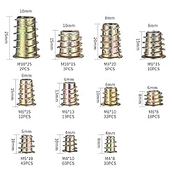 - Product Information - Product Name: Threaded Inserts Nuts - Material: zinc alloy - Color: As Shown - Size: M4/M5/M6/M8/M10 - Quantity: 230 Pieces Package Includes: M4 x 8 - 30 pieces M4 x 10 - 60 pieces M5 x 10 - 45 pieces M6 x 8 - 18 pieces M6 x 10 - 32 pieces M6 x 13 - 13 pieces M6 x 15 - 12 pieces M8 x 15 - 10 pieces M8 x 20 - 5 pieces M10 x 15 - 3 pieces M10 x 25 - 2 pieces Features: - Made of high quality zinc alloy material, which is strong and durable. - Unique male self-tapping thread with good tensile strength, can effectively prevent and remove due to torsion or vibration. - All screw sockets are packed in a storage box, easy to use, carry and find. - Suitable for soft woods such as pine, plywood, fiberboard, etc., have a good effect in the furniture combination. - You will get 230 pcs threaded inserts for wood, in the size of M4/M5/M6/M8/M10, enough for your daily use. Warm Tips - If you have any questions about how to use the hardware nuts, please feel free to contact us. We will solve your questions as soon as possible.