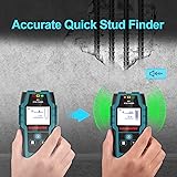 【Professional Stud Finder】: 5 scanning functions: Stud scan exact mode 0.8 inch(20mm), stud scan deep mode 1.5 inch(38mm), AC Wires scan 2 inch(50mm), Ferrous metals scan 4.7 inch(12cm) and Non-ferrous metals scan 4 inch(10cm). According to your needs, you can switch to the appropriate mode to help you find the edges and center of nails, screws, rebar, wooden beams, wires behind walls, floors, and ceilings. 【Easy To Read】: The signal strength display area on the display screen can clearly show the detection depth distance to the metal object. Scan mode, detection depth, detection signal strength, battery indicator and center point can all be seen on the screen. 【Fast And Accurate】:The stud finder can be calibrated automatically, just press the metal detection button. Note: Auto-calibration must be performed without nails, AC wires or metal, otherwise the test results will be inaccurate. 【Easy To Use】:HANMATEK stud finder with audible alarm (can be switched off) and 3 color indicator lights, green light indicates that no target is detected; orange light indicates that the edge of the target is detected; and the Red backlight indicates that the center of the stud is detected. Ergonomic design allows comfortable grip at any angle. The rubber on the back can prevent damage to the wall, safe and convenient. 【Wide Range Of Applications】: The wall stud finder quickly detects metal and wooden AC cables hidden in the walls, floors and ceilings of your home, helping you to avoid hazards when installing TVs, cabinets and more.