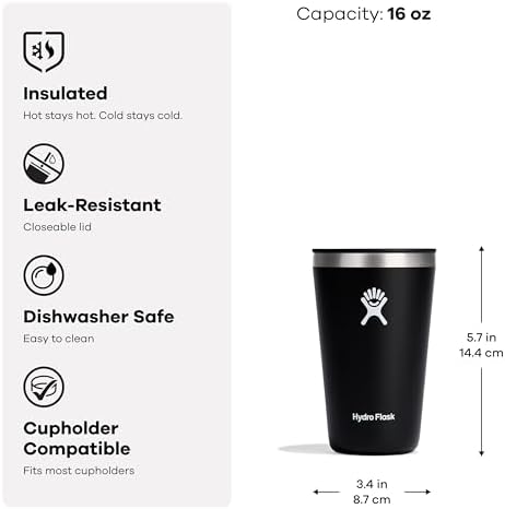 • 16 OZ BLACK INSULATED TUMBLER: The 16 oz All Around Tumbler is ready for morning brews or microbrews, keeping drinks cold or hot for hours. The leak-resistant lid slides snugly shut to keep splashes at bay.