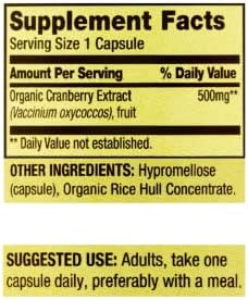 Each vegetarian capsule contains 500 milligrams of organic cranberry extract. The suggested adult dosage is one capsule daily, preferably with a meal. These capsules are free of gluten, yeast, wheat, milk or milk derivatives, lactose, sugar, soy, and artificial colors and flavors. They contain less than 5 milligrams of sodium per capsule and STS Sticker