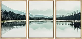 NWT Framed Canvas Print Wall Art Set Teal Mountain Range Lake Forest Landscape Nature Wilderness Modern Art Rustic Scenic Relax/Calm for Living Room, Bedroom, Office - 24"x36"x3 Natural