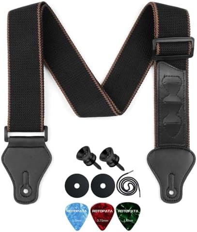 ROTOPATA Acoustic Guitar Strap, PU Leather Ends Guitar Accessories with 2 Buttons 2 Locks 3 Guitar Picks for Bass Electric Ukulele (Black)
