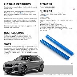 Package includes:2pcs Car Front Grille Insert Stripes Trim. Material:The Grille Insert Trim is made of premium quality PVC material with bright Blue color,which is anti-corrosion and water-resistant ,no worry about being faded. Fitment:Compatible with BMW X3 F25 G01 2011-up,X4 G02 2018-up,X5 G05 2019-up Easy installation:Just following the steps,you can easily enjoy the charming look of your car.1.Open the front grille with a screwdriver.2.Clean the water tank protection bracket.3.Put the trims on the bracket and adjust it.4.Put back the front grille and finish. Perfect for exterior decoration, improve the exterior appearance of your Vehicles, shown as pictured,giving your car a unique look and prevent your car from scratch and dirt.