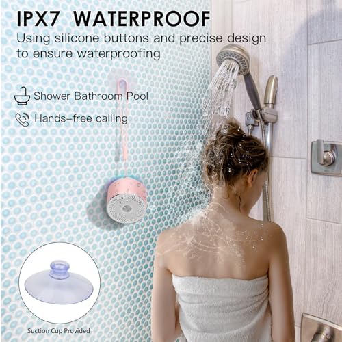 Mini Bluetooth Shower Speaker, IPX6 Waterproof Speaker, with RGB Lights, Mic, Portable Silicone Lanyard, Suction Cup, Clear Sound&Rich Bass, 12h Playtime, Small Pink Gifts for Girls Women