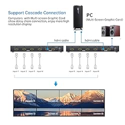 2 Input 4 Output: Yinker 2x2 HDMI Video Wall Controller is 2 HDMI Input and 4 HDMI HD Outputs.Allows to switching between 2 HDMI sources and enjoying them in the same display mode with audio extrator. 1 in 4 out HDMI Video Wall supports 8 splicing modes: 1X1,1X2,1X3,1X4,2X1,2X2,3X1,4X1. Plug and play, driver-free. Support 180 degree rotate in 2x2 mode. 4K Video Wall Controller Support max 3840x2160@30Hz & HDMI 1.4 & HDCP 1.4, downwards compatible with 1920X4320\5760X1080\7680X1080\1280x720P@60Hz\1920x1080@60Hz. Simple and handy switching by panel buttons and IR remote controller. Allows conveniently switching from long distances. Also support DIP Switching. Package includes 1xHDMI Wall Controller, 1xPower Adapter, 1xIR Remote, 1xMount Kit and 1xUser Manual. For HDMI cables please search ASIN:B0982XP6PH/B0B6F3M14S.