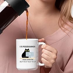 MEANING: For a programmer who is so immersed in the computer all day, nice hot coffee in a funny mug will jumpstart their day. Do you want to surprise your boyfriend, dad, husband, brother, uncle, or friend who is a programmer on their special day? Or want to show appreciation to your best programmer ever? Show appreciation for their hard work with this humorous coffee mug with the quote “I R Programmer I Make Computer Beep ” and make them laugh real hard and make them feel special. PREMIUM CERAMIC COFFEE MUG: This high-quality 11oz ceramic white mug has a premium hard coat that provides crisp and vibrant color reproduction sure to last for years. Printed on both sides for either left or right-handed person so the awesome message and art will be visible. High-gloss and has a premium white finish that can make you enjoy your drink more. Can also be used as pen holders on your office work table, planter for your kitchen herb, jewelry holder, or serving your favorite dessert. RELATABLE HUMOROUS QUOTE: Put a smile on their face with this “I R Programmer I Make Computer Beep Boop Ceramic Coffee Tea Cup 11oz. This drinking mug has a funny relatable quote that can make any programmer smile while sipping his or her favorite drinks. A stressful work day can also be fun with this drinkware on their dining or work table. A perfect conversation starter, and sure to amuse anyone. Trust us, you'll want this for yourself if you are a programmer and cat lover yourself. FUNNY PRESENT: Perfect affordable present to your boyfriend, dad, husband, brother, uncle, or friend who is a programmer, programming student or teacher, co-worker, classmate, or boss. Best item for birthdays, Valentine’s, graduation, holidays, wedding anniversaries, Christmas, work events, or any special milestone that occurs in life. Great item for your friends and family member who can relate to this good message and make them smile every time they use it. DISHWASHER AND MICROWAVE SAFE: These fantastic drinking mugs can go straight in the dishwasher, all day every day, meaning it can save you time, and be more hygienic. Perfect for your favorite hot or cold beverages. Easily reheat that coffee or tea you forgot to drink right away because it is microwave safe. Saves you time, is very convenient, and is perfect for your busy lifestyle.